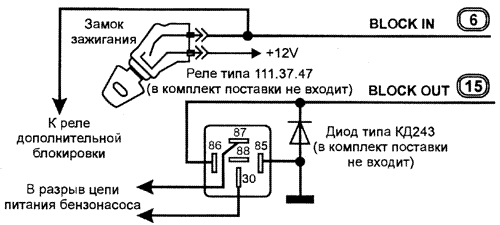 Если блокировка двигателя осуществляется по цепи питания бензонасоса, то схему подключения системы следует производить согласно рисунку: