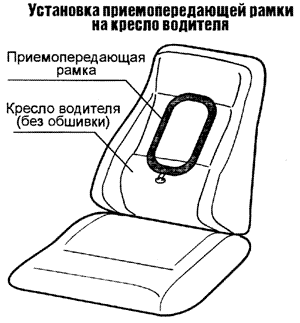 Перед установкой приемопередающей рамки в кресло, особенно на автомобилях импортного производства, проверьте достаточность радиуса действия системы наложением и плотным прижатием рамки к спинке кресла. В исключительных случаях возможно уменьшение зоны распознавания, обусловленное наличием непосредственно под обшивкой кресла большого количества металлических конструкций (сеток, реек, моторов и т.д.). В этом случае можно попытаться установить рамку в другом месте, например, в дверь водителя. Не разбирая дверь, приложите рамку к обшивке двери и проверьте дальность распознавания.