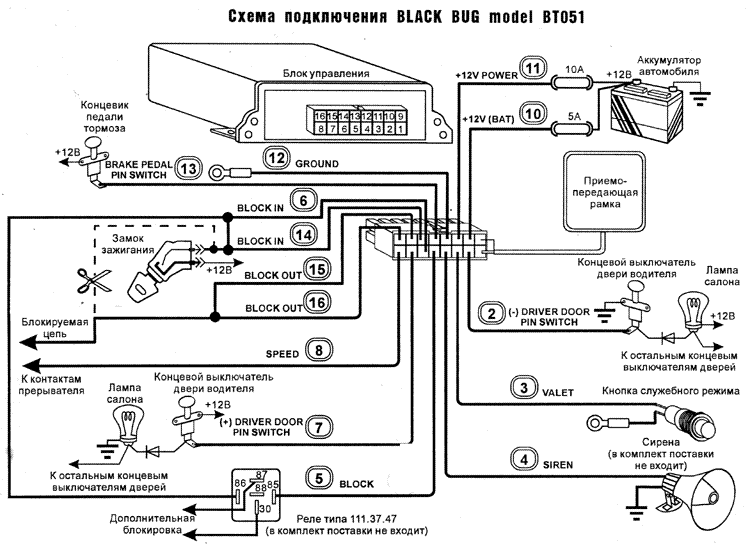 Система BLACK BUG ВТ-051 состоит из основного блока, приемо-передающей антенны и транспондеров. Транспондер представляет собой пластиковую карточку или электронную "метку", выполненную в виде брелка.