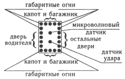 Если за время охраны отключалось питание, нажималась педаль тормоза или включалось зажигание, на индикаторе отобразится схема датчиков без мигающих элементов.