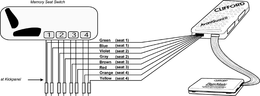 Дистанционное управление положением сиденья - При снятии системы с охраны она активирует заводское устройство запоминания положения сиденья. Вы можете запрограммировать любое из четырех положений сиденья для каждого из четырех передатчиков. Например, когда вы снимаете систему передатчиком №1, система автоматически установит его в положение 1, при снятии системы с охраны передатчиком №2, она установит его в положение 2 и так далее, комбинируя четыре передатчика с четырьмя положениями сиденья.