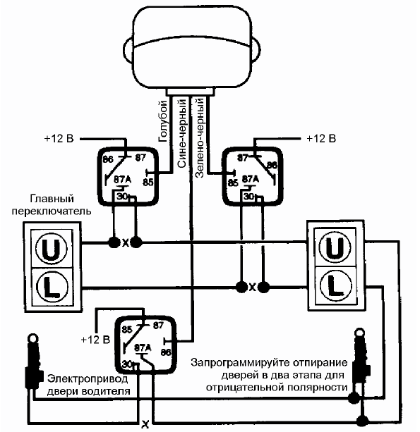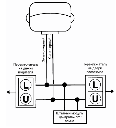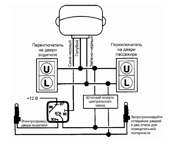 - Выходы для запирания и отпирания дверей автомобиля с пульта дистанционного управления .