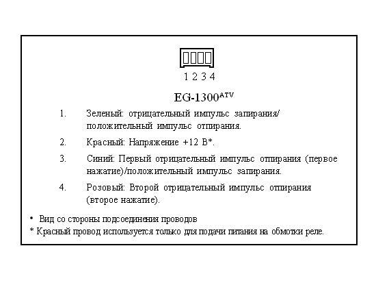 Примечание. Поскольку для управления таким типом системы замков требуется импульс силой тока более 500 мА, необходимо использовать реле.