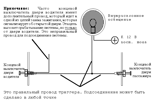 Примечание 2. На тех автомобилях, где на панели приборов стоят индикаторы закрывания дверей, все двери изолированы друг от друга диодами. Не соединяйте вместе все концевые выключатели. В таком случае необходимо подсоединить ЗЕЛЕНЫЙ провод к проводу, по которому осуществляется непосредственное питание внутрисалонного освещения автомобиля.