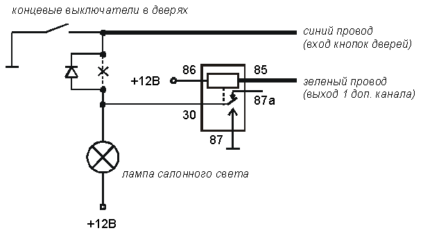 Синий провод - подключите к кнопочным выключателям дверей, багажника и капота, дающим замыкание на корпус при открывании.