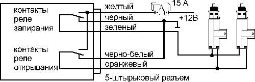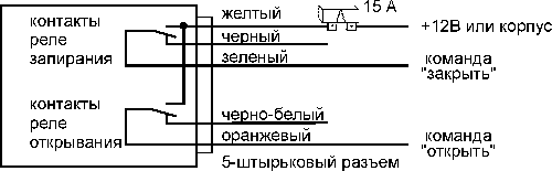 Зелено-белый провод - отрицательный выход для первоначального отпирания двери водителя. Максимальная нагрузка - 500мА, для подключения используйте дополнительное реле.
