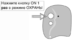 В режиме ОХРАНЫ нажмите и отпустите кнопку ON брелока. Система будет подавать звуковые и световые сигналы в течение 10 секунд, после чего перейдет в режим ОХРАНЫ. Для досрочного возврата в режим ОХРАНЫ достаточно нажать на любую кнопку.