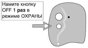 В режиме ОХРАНЫ необходимо нажать на кнопку OFF брелока. Система подаст два звуковых и два световых сигнала. Индикатор состояния системы погаснет, зажигание разблокируется. Если установлены и подключены приводы замков дверей, кнопки дверей поднимутся.