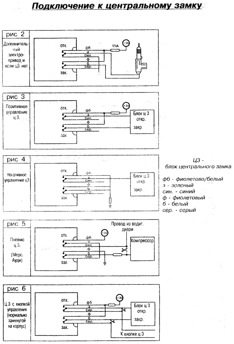- 6-контактный разъем центрального замка - подключается к штатному переключателю центрального замка автомобиля или к приводам замков дверей. В любом случае устанавливать предохранитель нужного номинала. Не перегружать контакты внутренних реле. Например, актуаторов "UNIKA" можно подсоединять не более 4 шт. В случае необходимости использовать дополнительные реле. Схемы подключения прилагаются.