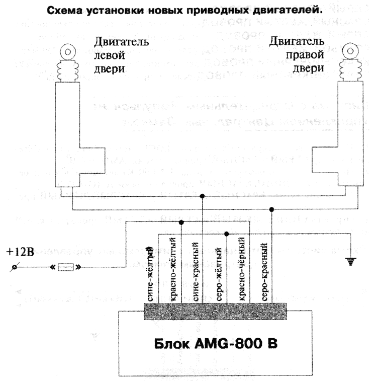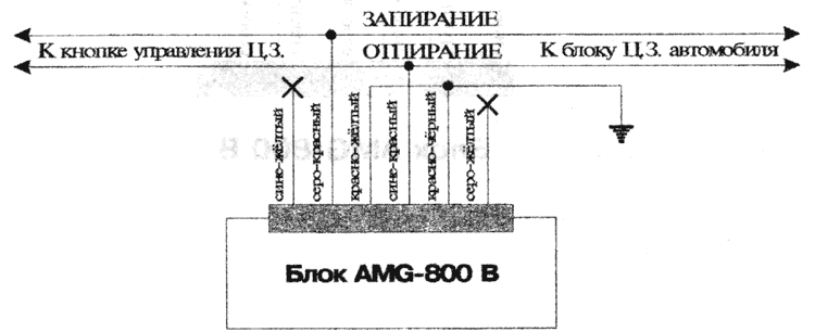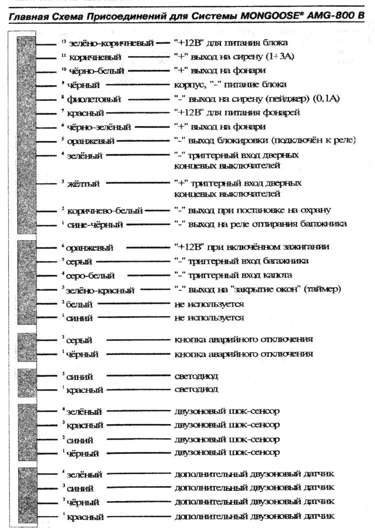 Система Mongoose AMG-800 В поставляется с универсальной системой запирания дверей, имеющей шесть проводов. Смотри приложенные диаграммы, на которых показаны схемы соединений для негативного управления, позитивного управления, установки новых приводов и пневматического привода.