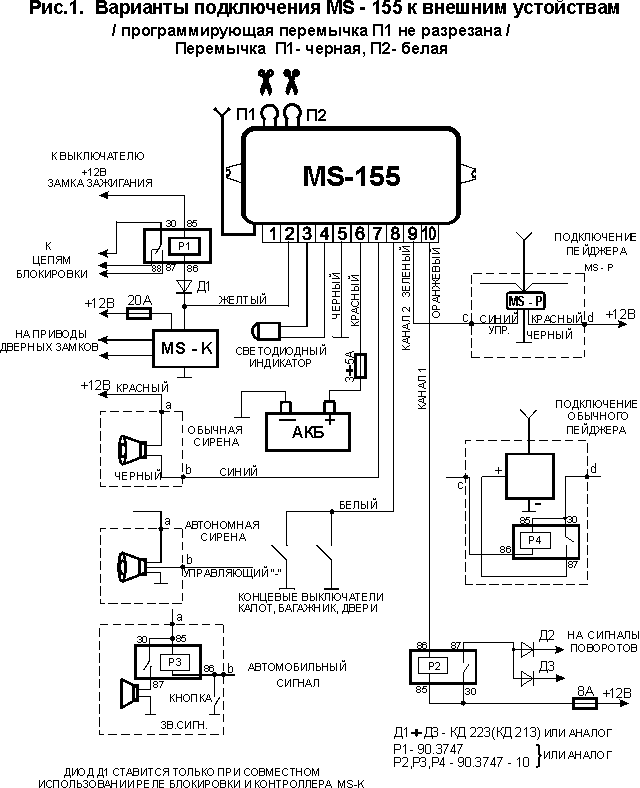 Микропроцессор охранной автосигнализации MS-155 управляется однокнопочным радиобрелком с постоянным кодом Keeloq(r). Непосредственно охрану автомобиля осуществляет встроенный многоуровневый вибродатчик с адекватной реакцией. По характеру сигналов тревоги Вы точно различите степень покушения на Ваш автомобиль. Совместно с вибродатчиком о покушении сигнализирует одна контактная зона. Противоугонная функция системы может быть реализована путем блокировки запуска двигателя во время охраны по одному каналу.