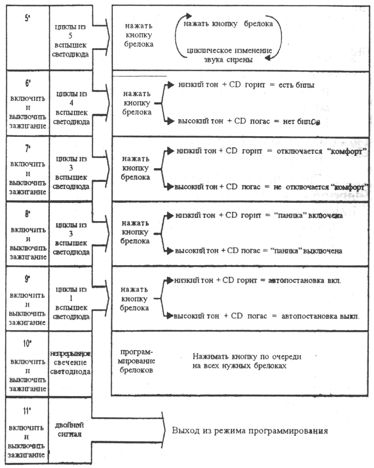 Очень важно, если Вы не хотите записывать в память новые брелоки, быстро выйти из этого режима. Иначе в память может быть записан код чужого брелока. Если это произошло, и Вы услышали подтверждающий запись бип сирены, без нажатия кнопки на собственном брелоке, то Вы должны немедленно записать в память код собственного брелока (так как при записи нового, все остальные стираются из памяти), выйти из этого режима, и затем, войдя в него снова, записать в память коды всех своих брелоков.