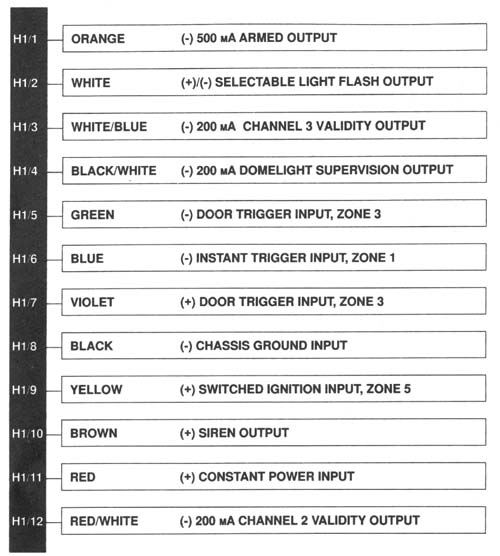 H1/1 ORANGE (-) ground-when-armed output: This wire supplies a (-) 500 mA ground as long as the system is armed. This output ceases as soon as the system is disarmed. The orange wire is pre-wired to control the 8618 starter kill relay.
