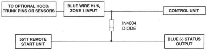 There are times when you need to temporarily bypass all sensor inputs to the unit, such as when remote starting the vehicle. Anytime an auxiliary channel output is used, all inputs are bypassed for 5 seconds. During the 5 second bypass period, ground can be supplied to the H1/6 BLUE wire without triggering the unit. When the 5 second bypass period ends, if the unit sees ground on the H1/6 BLUE wire, all trigger inputs except the door trigger input will remain bypassed until 5 seconds after ground is removed from the blue wire. This can be done using the status output of a 551 T remote start unit as shown below: