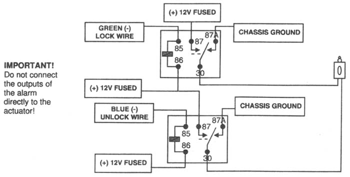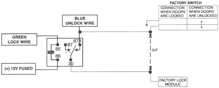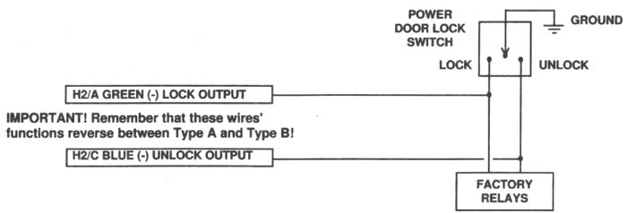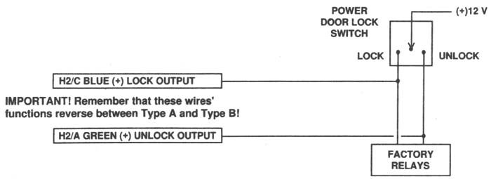 If you cannot get to the switch, and you find a set of wires that pulse (+) 12V alternately on lock and unlock, you must take care to ensure that it is not a Type Ñ direct-wire system.
