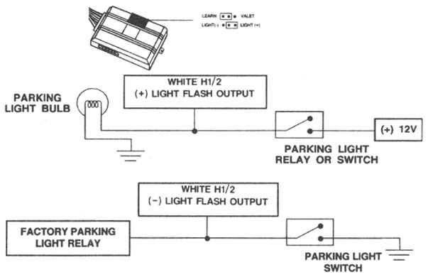 H1/2 WHITE light flash output: As shipped, this wire should be connected to the (+) parking light wire. If the light flash polarity jumper under the sliding door is moved to the opposite position (see below), this wire supplies a (-) 200 mA output. This is suitable for driving (-) light control wires in Toyota, Lexus, BMW, some Mitsubishi, some Mazda, etc.
