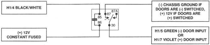 H1/5 GREEN (-) door trigger or H1/7 VIOLET (+) door trigger input: If the door switch wire you found is (-) when the door is open, connect the GREEN wire to it. If the door switch wire you found is (+) when the door is open, use the VIOLET wire instead.