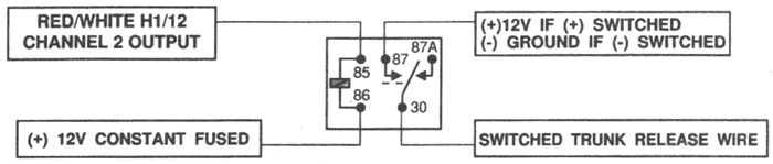 H1/12 RED/WHITE channel 2, 200mA (-) output: When the system receives the code controlling channel, for longer than 1. 5 seconds, the red/white will supply an output as long as the transmission continues. This is often used to operate a trunk/hatch release or other relay-driven function.
