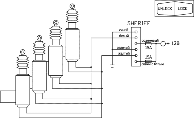6-контактный силовой разъем управления электроприводами замков дверей автомобиля: оранжевый, синий с белой полосой, желтый, белый, зеленый и синий провода большого 6-контактного разъема системы подключены к контактам встроенных реле запирания/отпирания замков дверей автомобиля. Функции каждого из этих проводов приведены ниже.