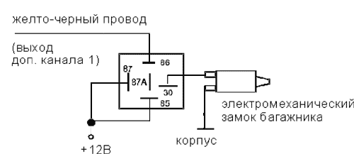Желто-черный провод (№12) - отрицательный выход дополнительного канала №1. Длительность сигнала управления 0,8 секунды. Максимальный ток нагрузки 300мА. Канал может быть использован для управления соленоидом отпирания багажника. Для подключения требуется дополнительное реле. Пример схемы подключения приведен на рисунке.
