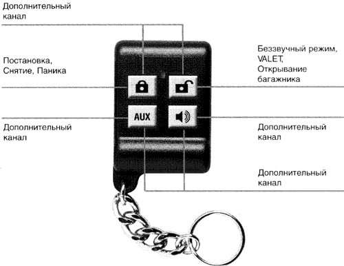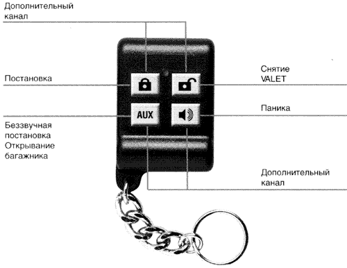Не отпуская кнопку VALET, нажмите ту кнопку брелка, которой ВЫ хотите управлять данной функцие.й Сирена даст один звуковой сигнал, подтверждая, что обучение произошло успешно. Отпустите кнопку брелка и переходите к программированию следующей функции.