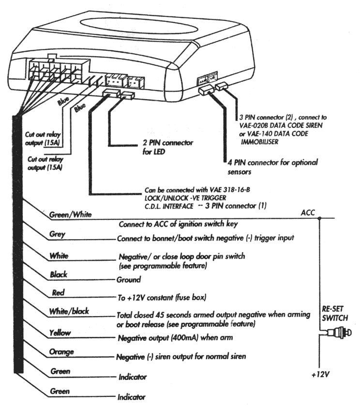 | 3 PIN connector (2) | Connect to VAE - 020B DATA CODE SIREN or VAE - 140 DATA CODE IMMOBILISER |