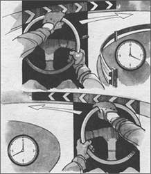 “10 — 2” или “9 — З” (по аналогии с цифрами на циферблате часов). При необходимости маневра руки смещаются на боковой сектор рулевого колеса. Их положение при повороте налево—“8—12”, направо—“12—4”. Эти положения обеспечат готовность к действиям в критических ситуациях на дуге поворота, т. е. к экстренным маневрам — коррекции поворота (“до-вороту”), объезду препятствия — и стабилизации автомобиля при потере устойчивости и управляемости. Кроме того, положение рук на боковом секторе (боковой захват) позволяет противодействовать выравниванию автомобиля, вызванному самостабилизацией передней подвески, и центробежной силе, смещающей корпус водителя к наружной стороне.Боковой захват позволяет обеспечить несколько приемов управления, способы выполнения которых следующие: