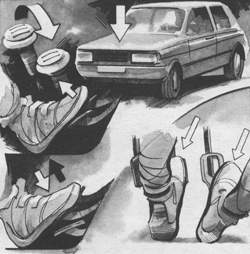 - это сигнал водителю о совершенной ошибке, соскальзывании, сносе управляемых колес. Это явление сопровождается торможением и частичной потерей управляемости, т. е. чем больше визга, тем меньше скорость и, естественно, профессионализма. Водитель экстракласса стремится к полной бесшумности прохождения поворота на грани сноса передних колес. Если снос возник, то его можно погасить уменьшением оборотов двигателя или выравниванием автомобиля в тех случаях, где это позволяют ширина проезжей части и заданная траектория движения.Для повышения безопасности без снижения скорости можно воспользоваться специальным приемом. Это легкое подтормаживание левой ногой на дуге длинного крутого поворота при постоянном дросселировании. Таким приемом легко прекратить соскальзывание переднего наружного колеса и загрузить его. Касание тормозной педали должно, быть легким и дозированным, исключающим блокирование колес.