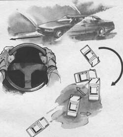 Критическая ситуация чаще всего возникает после аквапланирования, когда передние колеса вступают в контакт с твердым грунтом. Когда автомобиль попадает в лужу, контакт с препятствием (водой) чаще всего происходит вначале одним из передних колес. Торможение при этом вызывает вращательный импульс и занос под определенным углом, под которым автомобиль попадает в воду. Даже хорошо подготовленный профессионал тотчас реагирует на занос, забывая, что реакция опоры не дает желаемого результата по стабилизации автомобиля. Когда автомобиль выходит на твердый грунт, его колеса повернуты и быстро реагируют. Реакция оказывается очень сильной в связи с тем, что задние колеса, скользящие по воде, не влияют на управление. Возникающий повторный занос, направленный в противоположную сторону, и является тем экстремальным моментом, который может привести к вращению и опрокидыванию, если водитель опаздывает со стабилизацией автомобиля тотчас после аквапланирования.