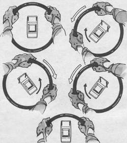 Если вам не удалось стабилизировать автомобиль на ранней стадии заноса, то после рывка двумя руками выполните “доворот” одной из рук, которая окажется в верхнем секторе рулевого колеса; одновременно “прикройте газ”. Лучше выполнять “доворот” левой рукой, чтобы освободить правую для экстренного включения понижающей передачи. Этот прием поможет повысить тягу двигателя, чтобы преодолеть центробежную силу, выбрасывающую автомобиль с дороги |