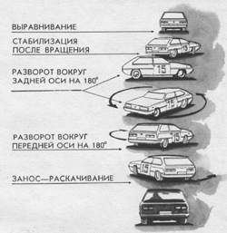 — вращение автомобиля на 180°. Разворот спиной к направлению движения вызывает у водителя психологический стресс. В результате он либо полностью отказывается от управления, либо реагирует резким торможением. В ряде ситуаций первая реакция оказывается более безопасной, так как происходит самостабилизация автомобиля вследствие конструктивных особенностей передней подвески (углы схода, развала и кастора передних колес).Активные действия по стабилизации следует применить тотчас после преодоления фазы критического заноса, когда полностью теряется возможность выровнять автомобиль для прямолинейного движения (угол заноса около