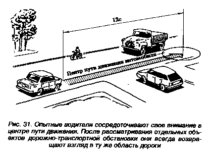При наблюдении за различными элементами дорожно- транспортной обстановки взгляд опытного водителя после фиксации на отдельных объектах или событиях постоянно возвращается в область центра пути движения. Его расположение зависит от условий движения. Обычно он находится посередине полосы движения, если автомобиль движется по прямому участку дороги. При движении по подъему или закруглению дороги центр пути движения располагается в месте, где будет находиться автомобиль, когда водитель закончит прохождение данного участка дороги.