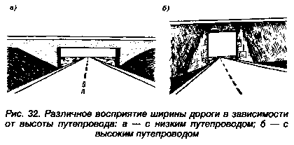Условия движения под путепроводами тоже имеют свою специфику. Видимость под ними ухудшена, поле зрения водителя ограничено опорами, сводами и пролетными строениями. Путепровод создает впечатление большего или меньшего сужения в зависимости от соотношения ширины и высоты проезда под ним. Например, при одинаковой высоте проезда широкий путепровод балочной конструкции кажется более низким по сравнению с таким же путепроводом меньшей ширины. Более высокий путепровод воспринимается суженным по сравнению с путепроводом, имеющим меньшую высоту.