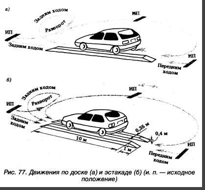 сначала передним ходом из положения прямо, затем задним ходом с разворота.