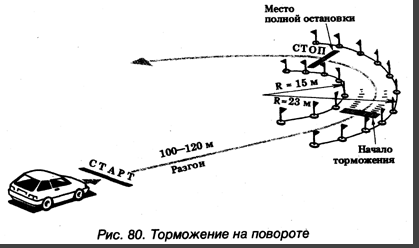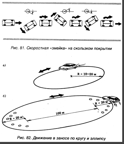 Отработка навыков торможения. Целесообразно учиться торможению на площадках с пониженным коэффициентом сцепления (0,1—0,2), так как именно на скользкой поверхности наиболее наглядно проявляется неумелое торможение. Оно приводит либо к длительному скольжению, либо к заносу и потере управляемости.