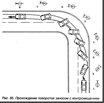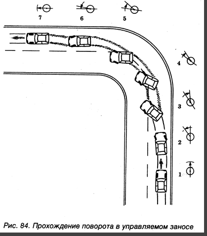 Обратите внимание, что во всех фазах вывода из заноса передние колеса автомобиля находятся строго в направлении движения. Рулевое колесо всегда поворачивается быстро, но без рывков, вначале синхронно, а затем с небольшим опережением заноса задней оси. Педалями сцепления и тормоза не пользуются, поддерживают умеренную подачу топлива.
