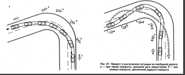 Если экстремальная ситуация возникла при правом повороте, то нужно попробовать увеличить радиус поворота и сгладить дугу поворота. Для этого (рис. 87, б): 1 — на входе в поворот попытаться снизить скорость; 2 — до начала закругления водитель поворачивает рулевое колесо влево (автомобиль выезжает на полосу встречного движения), включает свет фар или аварийную сигнализацию; 3 — в начале закругления дороги переводит рулевое колесо вправо, слегка увеличивает подачу топлива, и автомобиль движется по максимально спрямленной траектории; 4 — при выходе из поворота водитель незначительно поворачивает рулевое колесо вправо, чтобы плавно вернуть автомобиль на его полосу движения; 5 — скорректировав с помощью рулевого колеса траекторию движения на прямолинейную, водитель увеличивает подачу топлива.