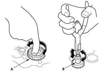 - Make sure the ATF pump drive gear (A) rotates smoothly in the normal operating direction, and the ATF pump driven gear shaft (B) moves smoothly in the axial and normal operating direction.