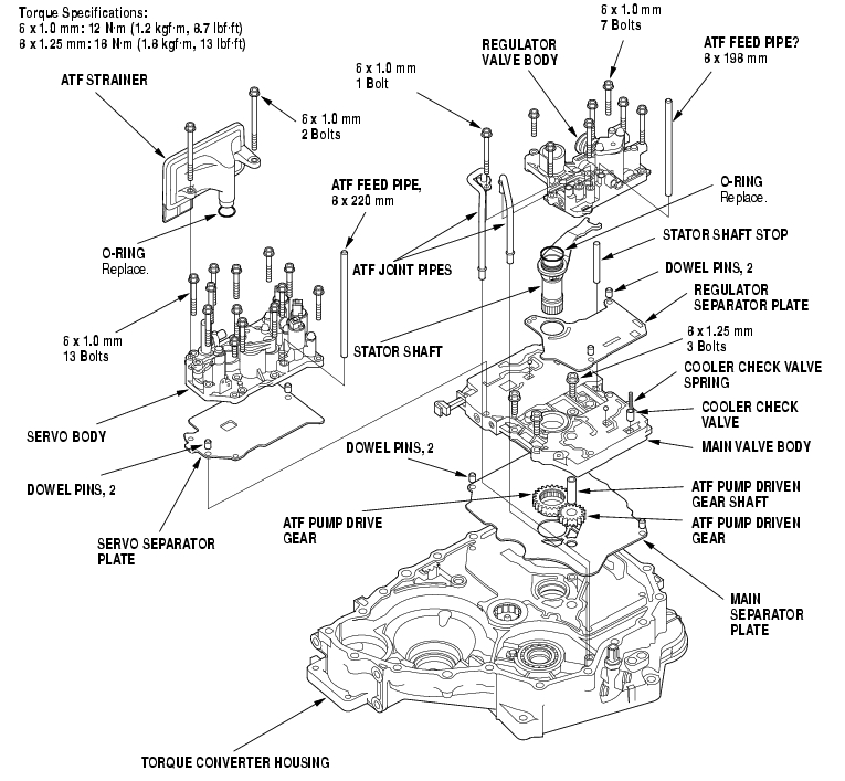 - If the ATF pump drive gear and ATF pump driven gear shaft do not move smoothly, loosen the main valve body bolts. Realign the ATF pump driven gear shaft, and retighten the bolts to the specified torque, then recheck. Failure to align the ATF pump driven gear shaft correctly will result in a seized ATF pump drive gear or ATF pump driven gear shaft.