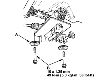 - Install the plates (A) and torque the rear differential mount assembly mounting bolts (B).