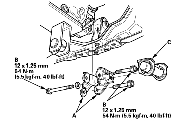 - Install the right and left rear differential mount brackets B (A) then torque the bolts (B) and damper (C).
