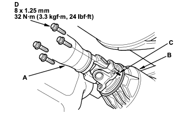 - Install the No. 2 propeller shaft (A) onto the rear differential (B) by aligning the reference mark (C). Be sure to use new mounting bolts (D).