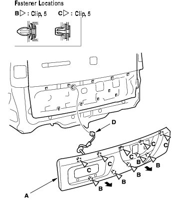 - Pull out along the bottom of the tailgate lower trim (A) to detach the lower clips (B). While pinching the upper clips (C) from inside the tailgate, remove the tailgate lower trim. If equipped, pull the license light harness (D) out from inside the tailgate.