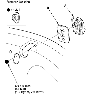 - Remove the nut from inside the tailgate, then remove the rear window wiper lifter (A) and the seal (B).