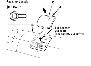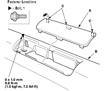 - Using a flat-tip screwdriver wrapped with protective tape, pry up on the middle lid (A) of the roof side front trim (B) to detach the hooks (C), and remove the bolts.