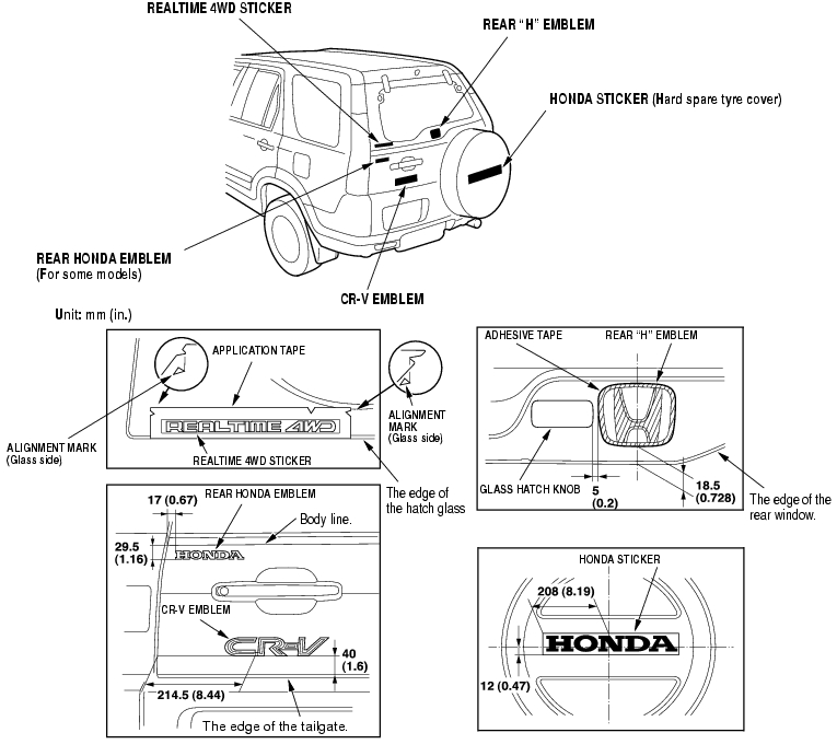 - Apply the emblem/sticker, where shown. When installing the REALTIME 4WD sticker on the hatch glass, align the application tape with the alignment marks, then press the sticker into place, and remove the application tape.