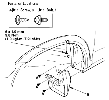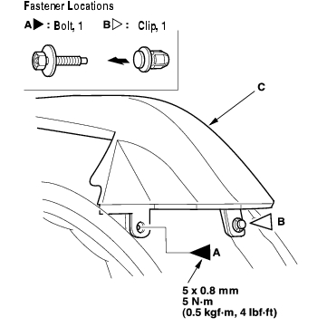 - Pull the inner fender (B) back as necessary, and remove the expansion clip (C).