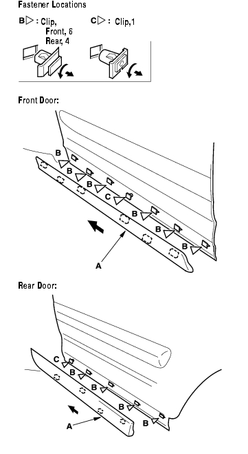 - Slide the door lower trim (A) forward and remove it. Clips (B, C) will stay in the body.