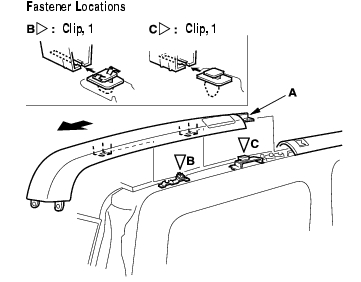 - Remove the roof side rear trim (A) from the clips (B, C) by sliding the trim rear ward, then remove the trim. Take care not to scratch the body.