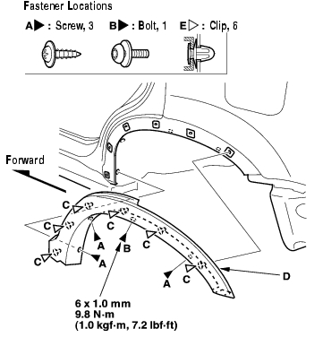- Remove the screw, then detach the wheel arch portion of the front bumper outward (see page 20-130) .